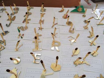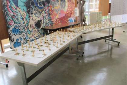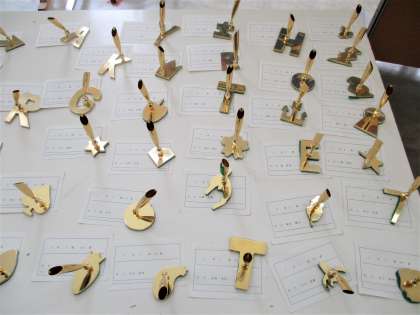 生徒玄関ホールに、3年生が制作した金属加工の作品「ペン立て」が展示されました。工夫されたデザインで、ぴかぴかに光ったペン立ては、とてもかっこいいです。