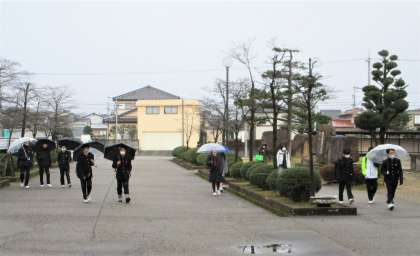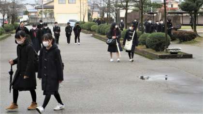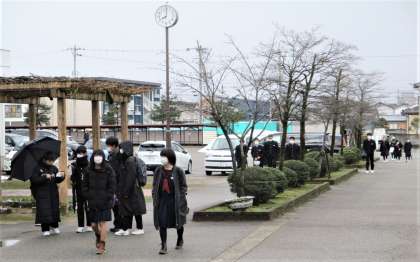 今朝は、小雪がちらつく肌寒い朝となりました。毎日の気温の変化が激しいので、生徒の皆さんは、十分に健康管理をお願いします。