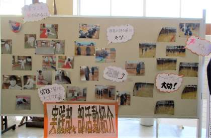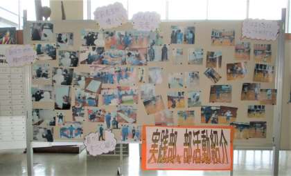 上の画像は、以前に掲示してあった、柔道部、剣道部バレーボール部の紹介です。現在は下の画像で、美術部、ボート部、サッカー部、男子バスケットボール部の紹介です。