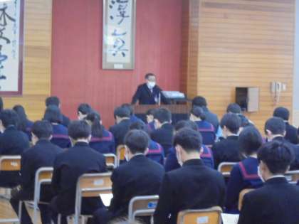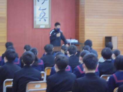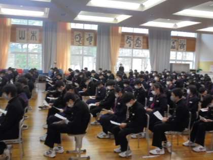 本日(8日)の5限、3年生が明日からの県立高等学校一般入学検査に向けての学年集会をランチルームで行いました。