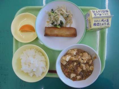 今日のメニューは、ごはん、マーボー豆腐、春巻き、ナムル、清見オレンジ、牛乳 でした。