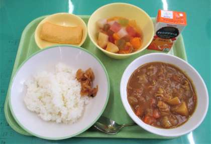 今日のメニューは、カレーライス、福神漬、玉子ロール、フルーツカクテル、オレンジジュース でした。