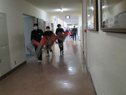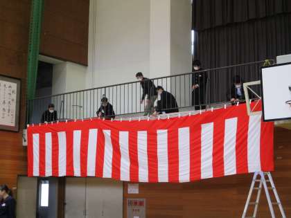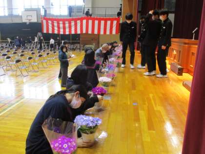 卒業証書授与式準備1 3月16日(火) 公開日 2021/03/16 更新日 2021/03/16 学校行事 5限後に、1,2年生が卒業証書授与式の準備を行いました。 2年生は主に体育館を担当しました。ランチルームから椅子を運び保護者席を用意したり、ステージに花鉢を並べたり、紅白幕を準備したり、椅子を整頓したり、掃除をしたりと、たくさんの仕事を分担して手際よく行ってくれました。
