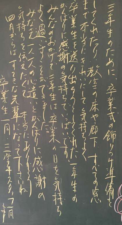 3月18日(木) 朝の風景 公開日 2021/03/18 更新日 2021/03/18 今日の大沢野中 おはようございます。晴天のさわやかな朝を迎えました。 卒業式翌日、3年生が使っていた1階教室は、どことなく寂しい感じがします・・・。 卒業生の教室の卒業祝画を担当した1年生の各教室の黒板には、卒業生担当学年の先生からお礼のメッセージが書かれていました。