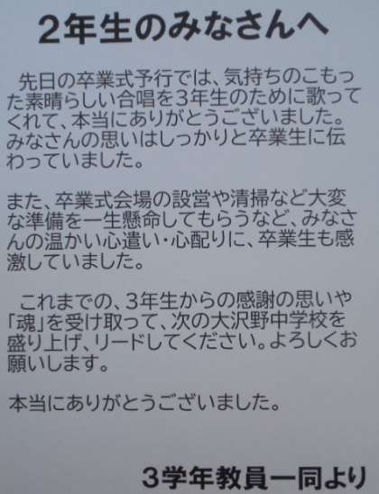 昨日の卒業証書授与式及び一昨日の予行等の体育館周辺の準備は、2年生が担当しました。お陰で、素晴らしい環境で卒業証書授与式を行うことができました。