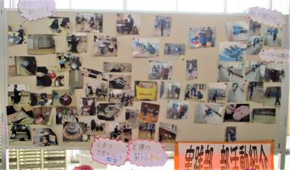 生徒玄関の部活動紹介画像。今回は、茶道部、女子バスケットボール部、吹奏楽部、ソフトテニス部男女です。