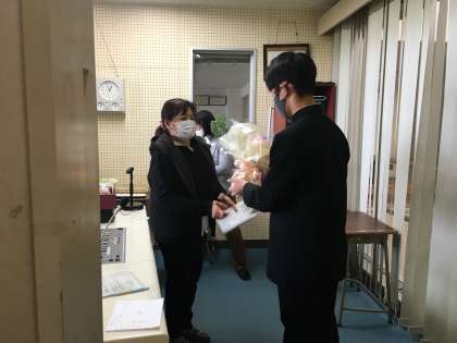 続いて、代表生徒から、感謝の言葉を英語で伝え、花束を贈りました。