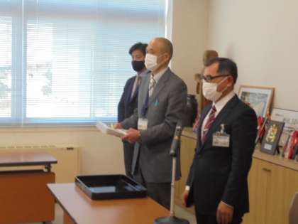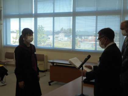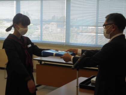 意見発表の後、1、2年生の代表生徒に、校長から修了証を授与しました。