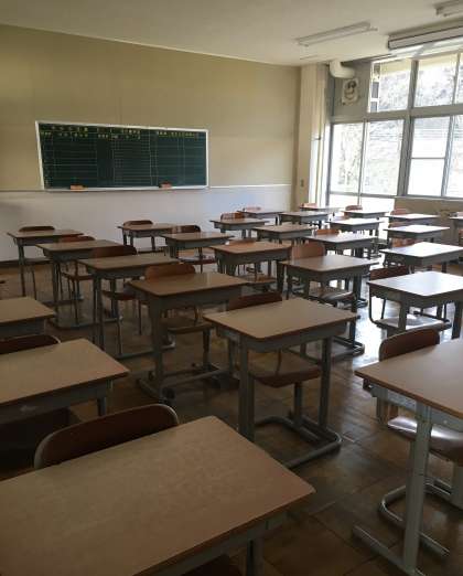 写真中:始業式、入学式に向けて整然と机いすが、整えられています。