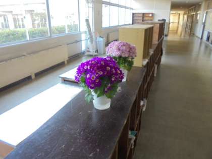 写真中:3学年廊下の様子。花がきれいに飾られ、