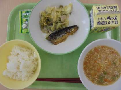 じゃがいものそぼろ煮、抹茶大豆、牛乳