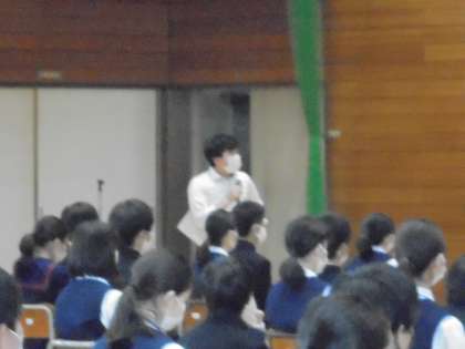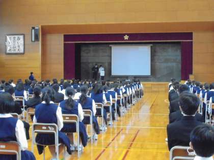 体育大会の2学年種目「玉入れ」のルール説明を体育館で行いました。