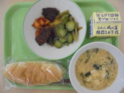 茎わかめサラダ、にらたまスープ、牛乳