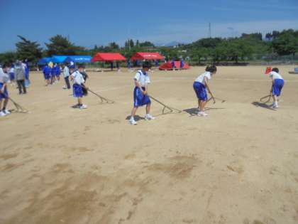 みんなが気持ちよく競技に取り組めるように、1年生はグラウンドの石拾い・ならしをしました。