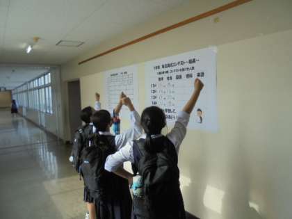 廊下には、クラスで満点だった人の数を掲示しています。2日目は、初日に比べて満点の人が増えていました。明日も”全員満点”を目指そう!!
