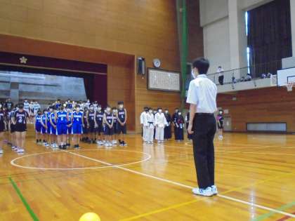 5限目に生徒会執行部主催の「富山市中学校総合選手権大会 壮行会」を行いました。生徒会長の激励の挨拶の後、各部活のキャプテンが今大会の意気込みを披露しました。がんばれ沢中生!