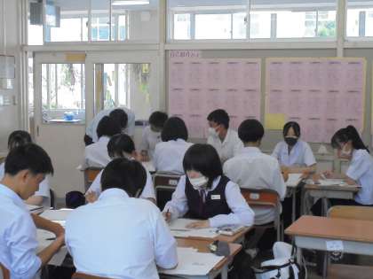 (上)31H 理科では植物の有性生殖について学習しました。(下)32H 数学では先週の確認テストの直しをしました。分からないところを班で教え合っていました。
