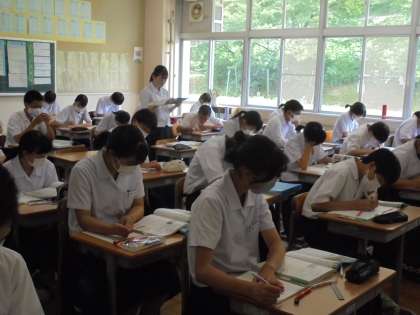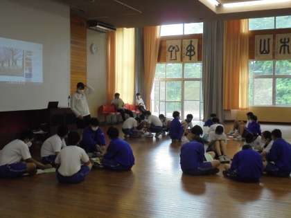 (上)33H 社会科の授業では情報化が進む現代について学習しました。(下)34H 保健体育ではダンス学習です。グループで振り付けや隊形移動について話し合っていました。