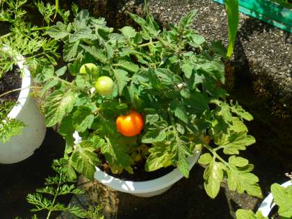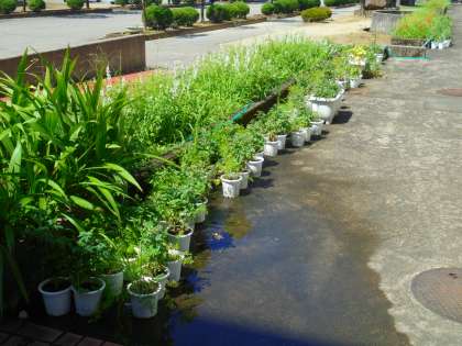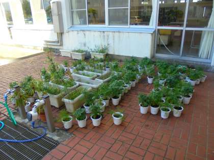 第2学年技術・家庭(技術分野)で育てている作物の様子です。猛暑が続くため、水やりを行わないとすぐに枯れてしまいます。朝と夕方の水やりは必須です。赤くなったミニトマトも確認できました。