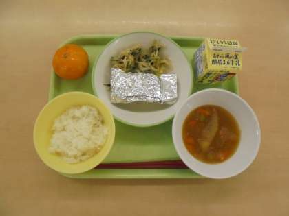 ごはん、牛乳、さばの銀紙焼き、はりはりあえ、冬瓜の吉野煮、冷凍みかんです。