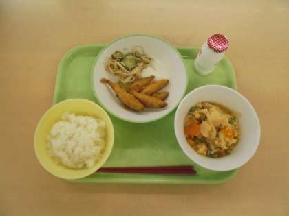 ごはん、飲むヨーグルト、高野豆腐の卵とじ、わかさぎのフリッター、甘酢あえです。