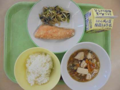 ごはん、牛乳、鮭のから揚げ、小松菜ともやしの香味あえ、