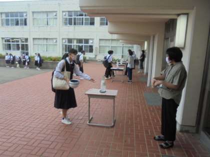 写真中 生徒玄関での手指消毒の様子