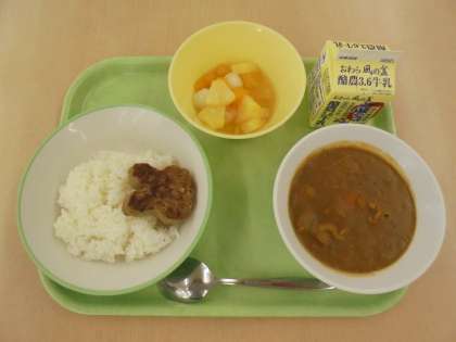 ごはん、牛乳、十五夜ハンバーグカレーライス、フルーツ白玉です。
