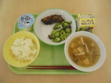 ごはん、牛乳、ふくらぎのえごま揚げ、枝豆のマリネ、豆腐スープ、ヨーグルトです。