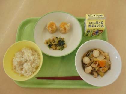 麦ごはん、牛乳、八宝菜、にんじんシューマイ、小松菜ひたしです。