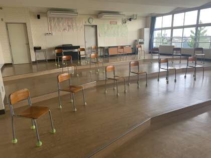 写真上 合唱指導に向けて、ディスタンスをキープ!
