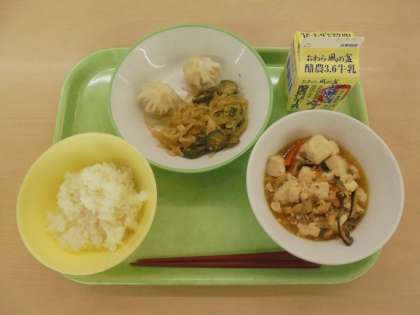 ごはん、牛乳、マーボー豆腐、えびパオツ、バンサンスーです。