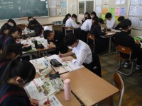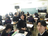33H理科(上)斜面を下る滑車にかかる力を測定する実験の説明を聞いています。この後、滑車の位置や斜面の角度が変わるとどのような結果になるのか予測し、班の仲間と協力して実験をしていました。