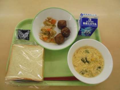 食パン、牛乳、ミートボールの照焼き、れんこんソテー、卵コーンスープ、チョコレートクリームです。