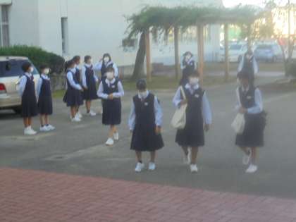 写真下 登校風景の一部です。朝から暑いですね。