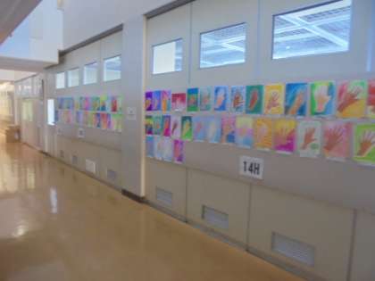 写真下 美術室前に1年生の作品が掲示してあります。