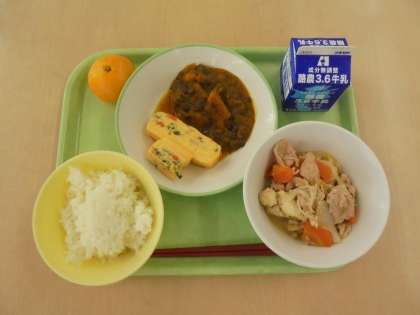 ご飯、牛乳、白菜なべ、千草焼き、かぼちゃのいとこ煮、みかんです。