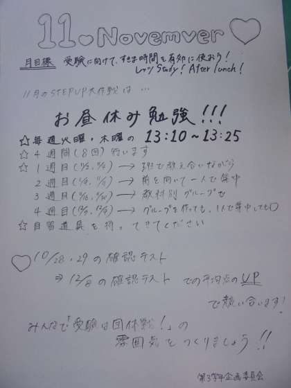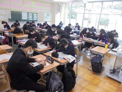 班長を中心に「毎週火曜・木曜の昼休みはみんなで勉強をしよう。」と呼びかけ、早速すべてのクラスで自主的に学習に取り組んでいました。さすが3年生ですね。「受検は団体戦」と言われます。この調子で受験に向かう雰囲気を高めていきましょう!