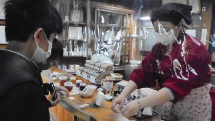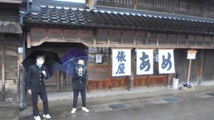 ひがし茶屋街で下車し、 飴の俵屋で飴づくりについて質問しました。