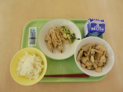 ご飯、牛乳、里いもと厚揚げのうま煮、きびなごのさくさく揚げ、