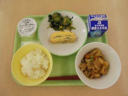 ご飯、牛乳、しいらの黒酢あんかけ、えごま入り卵焼き、小松菜サラダ、ラフランスヨーグルト です。