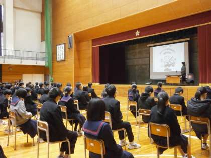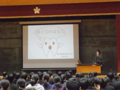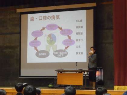 本日5限は歯科衛生士を講師としてお迎えし、1、2年生を対象に、体育館で「歯と口の健康について考えよう」というテーマで講話をしていただきました。コロナ禍での歯磨きで大切なことや、虫歯にならないためにはしっかり歯磨きをして予防をすることが大事であることなど、たくさんのことを学びました。