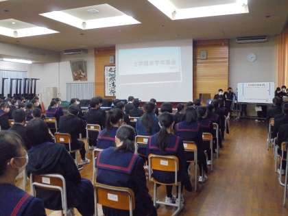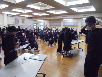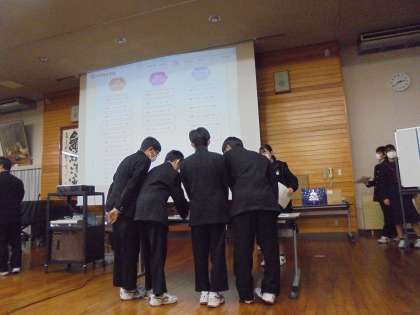 12月13日(月) 1学年「学年レクリエーション」 公開日 2021/12/13 更新日 2021/12/13 1年生の活動から 6限に学年レクリエーションでクラス対抗クイズ大会を行いました。 フラッシュ暗算、イントロクイズ、担任の似顔絵対決、今年の時事問題などいろいろな問題に挑戦しました。 優勝は11Hでした!みんなで盛り上がる時間になりました。