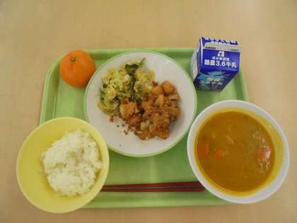 ご飯、牛乳、魚と大豆のゆずソースからめ、あわせあえ、冬至のだんご汁、みかんです。