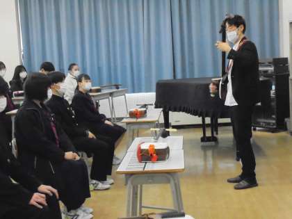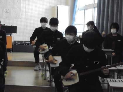 本日の音楽の授業では、講師の先生をお招きして三味線の演奏を体験しました。