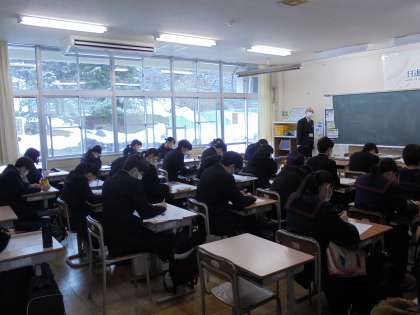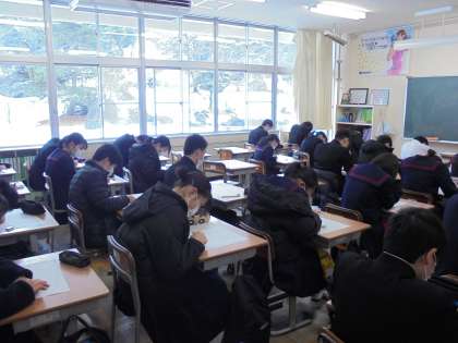 3年生は私立高校の一般入試を終え、残すところ県立高校推薦入試、国立高専と県立高校一般入試となりました。受験勉強もラストスパートとなり、ほとんどの授業では、過去の入試問題や演習問題を繰り返し解くなどのプリント学習をしています。