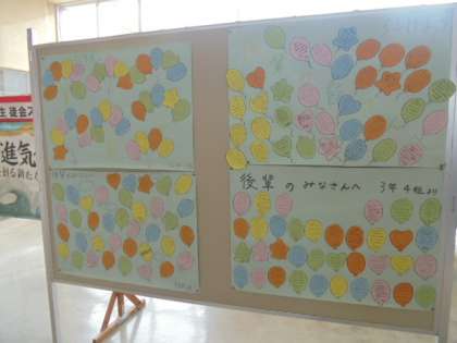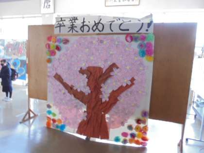 生徒玄関には在校生から卒業生へのメッセージが綴られた桜の木と、卒業生から在校生へのメッセージが掲示されています。