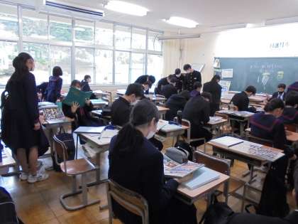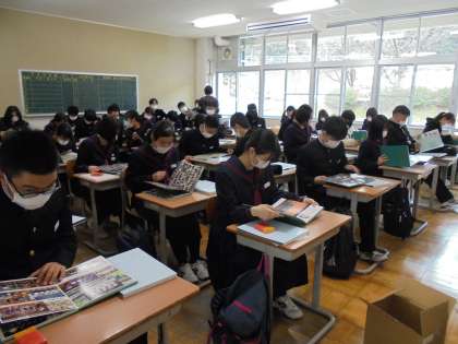 午前中は、式や予行を緊張感ある態度で過ごし、午後は学活で卒業アルバムが配布されました。どのクラスも、級友となつかしむ様子が見られ、和やかな雰囲気でした。