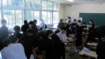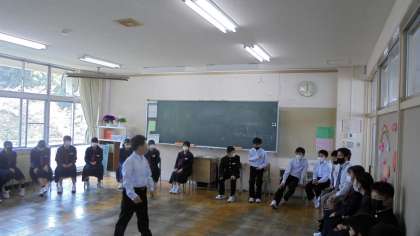 中1学力調査が終わり、ほっとした時間に自己紹介を行いました。学級ごとに、フルーツバスケットや「出会いのビンゴ」、一つの円陣などと様々な形態で実施しました。和やかな表情が見られ、楽しいひとときでした。
