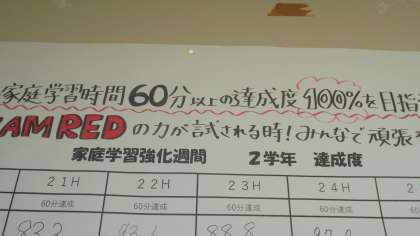 写真は、廊下掲示してある学修実践部の取組です。「60分」とはいえ、達成度は学年で90%を超えました。昨年から見ると、ずいぶんと数値が上がっています。また、生徒たちの様子を見ていると「2年生のテストは大事だから、がんばらないと!」という気合いが伝わってきます。